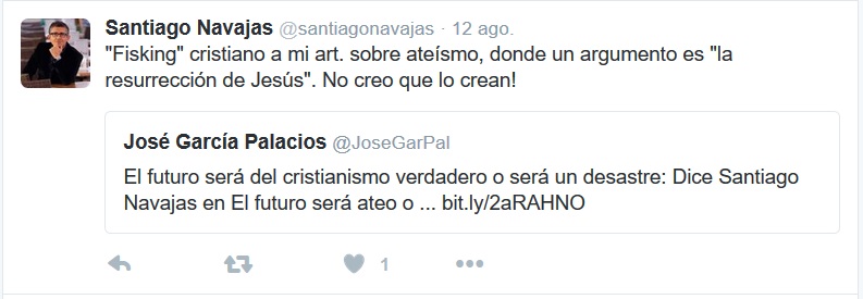 La frase del tuit sobre estas líneas de Santiago Navajas como respuesta a mi texto sobre la alternativa del cristianismo verdadero al ateísmo parece dejar claro que desde su superioridad intelectual no necesita más argumentos que una frase irónica.