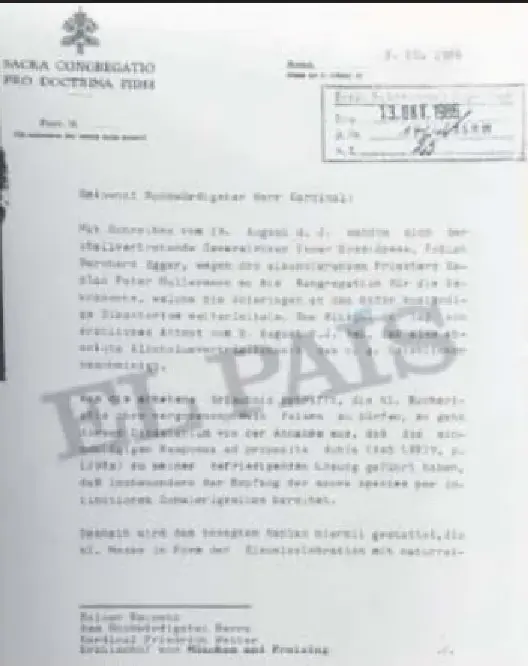 En febrero de 2023, Correctiv publicó un documento hasta entonces desconocido y que tampoco tuvo eco fuera de Alemania: demostraba que, en realidad, Ratzinger ya sabía en 1986 que ese sacerdote era un pederasta. Estaba en Roma, era desde 1982 prefecto de la Congregación de Doctrina de la Fe, y respondió a una petición del arzobispado de Múnich. Le habían preguntado si Hullermann podía oficiar la misa con zumo de uva, en vez de vino, por sus problemas de alcoholismo. Ratzinger dio su permiso.